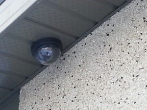 Signs that indicate security features and inexpensive faux motion activated video monitoring cameras. Smile, You’re on candid camera!!